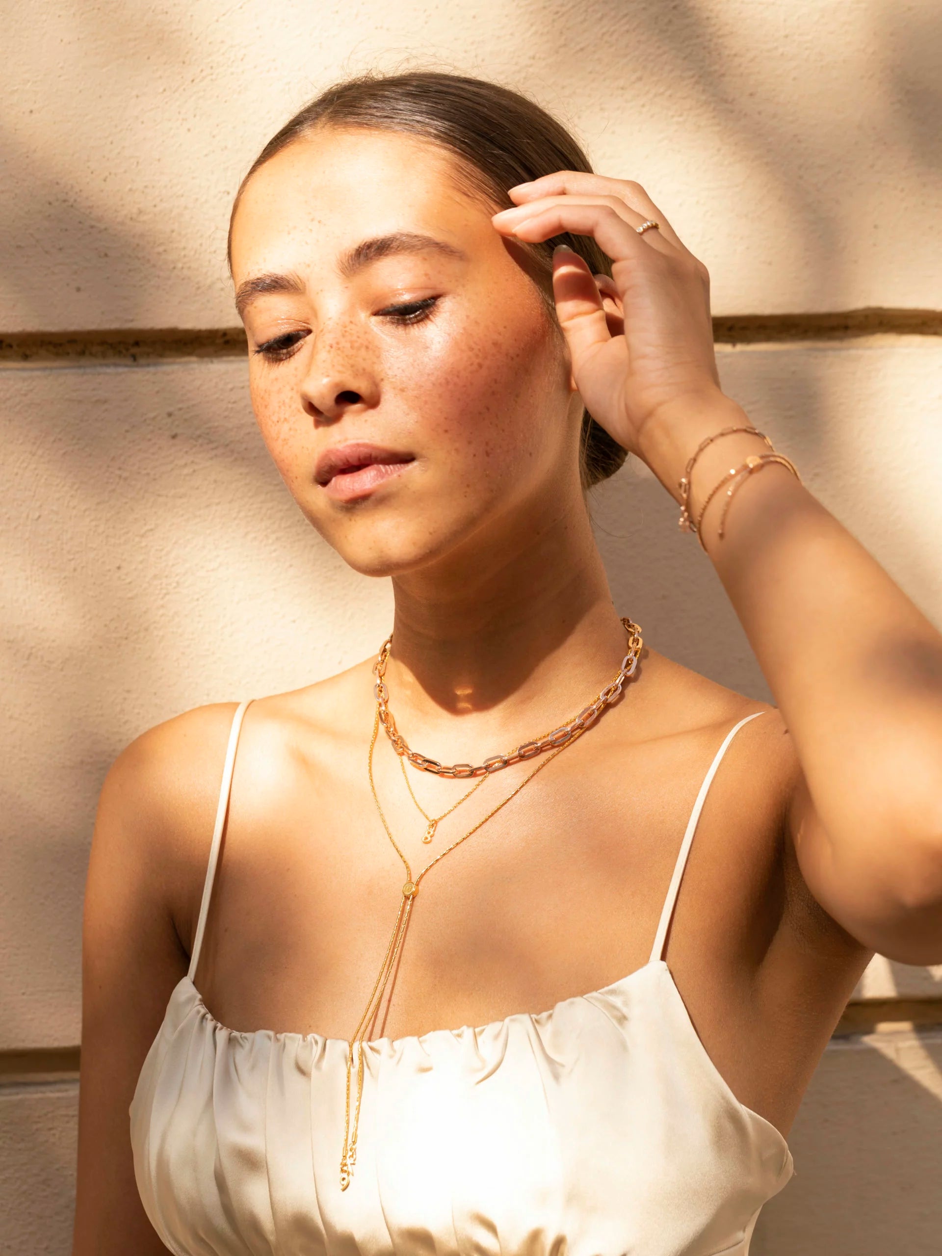 Jeder kennt es, das Gefühl von etwas Vertrautem aus der eigenen Kindheit. Es gibt einem Sicherheit und Wärme und schafft eine ganz besondere Form der sinnlichen Erinnerung. Genau diese Assoziation löst die ‚Modern Western‘ Kette bei mir aus. Ich entwarf sie mit dem Gedanken an meine Zeit im Reitsport, wo ich bei Western-Turnieren mit meinem geliebten Pony Nicki antrat. Die Form erinnert an Bolo Ties, ein Halsschmuck aus einem Lederband, das von einer dekorativen Spange gehalten wird. Neu interpretiert, in einer zeitgemäßen Formsprache umgesetzt und in Sterling Silber gefertigt, wird es zum alltäglichen Begleiter mit einer besonderen Bedeutung, die jeder mit einer ganz persönlichen Erfahrung belegen kann. Dieses Schmuckstück soll Dich an all das Schöne und Leichte erinnern, wonach Du Dich in Deinem Alltag manchmal sehnst. Auch ein filigranes Armkettchen mit dem unverwechselbaren Push Button begleitet Dich in die warme Jahreszeit und erinnert an den 90ies Look.