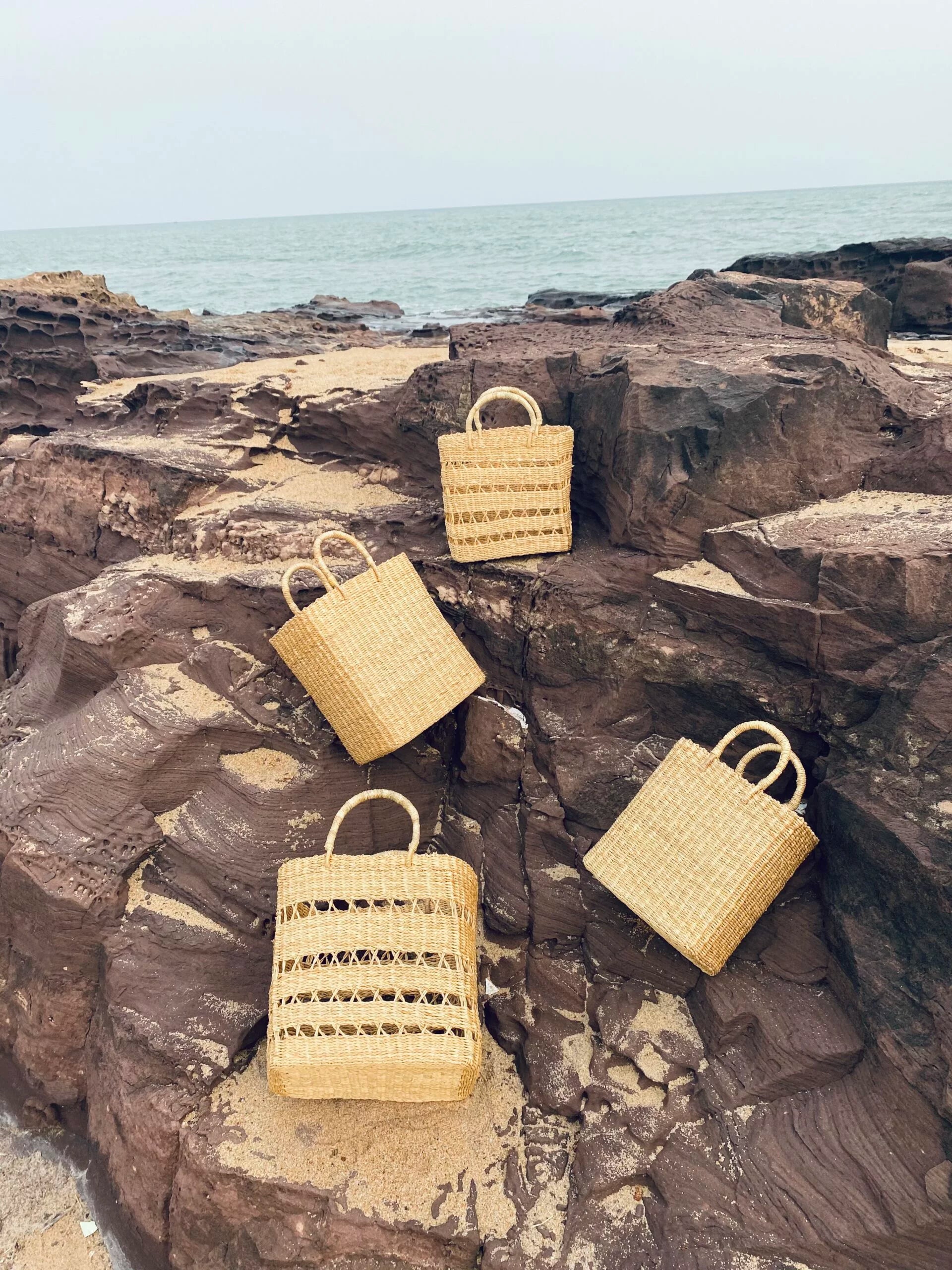 Die Korbtaschen sind inspiriert von traditionell ghanaischer Handwerkstechnik. In der Form und Farbe sind sie aber von zeitgenössischem Design beeinflusst. Eine spannende Verschmelzung von ghanaischem Handwerk und schweizerischer Klarheit widerspiegelt sich in den Produkten.